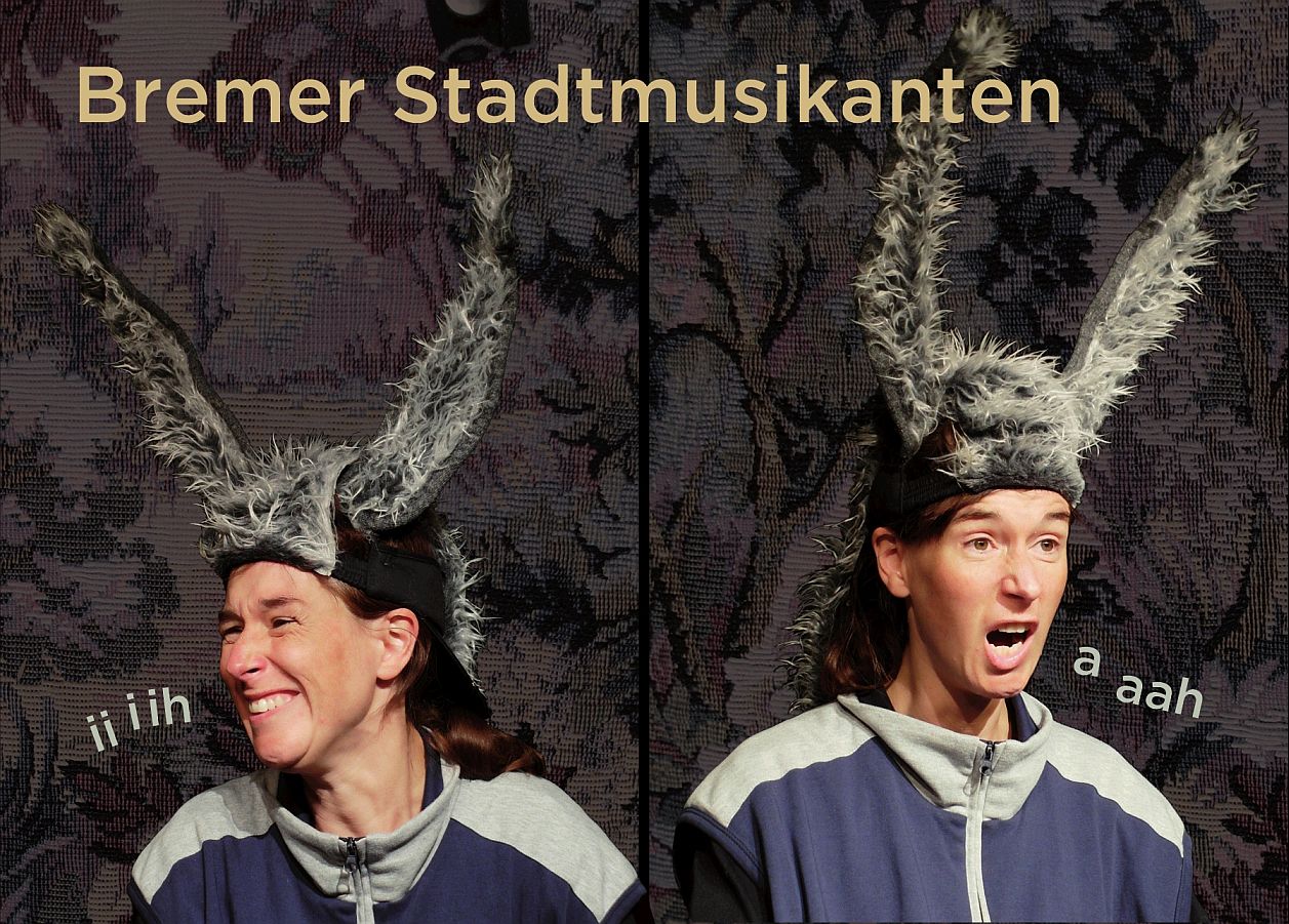 Geschlagen! Gefeuert! Zu alt! Dieses gemeinsame Schicksal verbindet Esel, Hund, Katze und Hahn. Aber sie haben einen Plan, denn: „Etwas besseres als den Tod finden wir allemal“. Zusammen machen sie sich auf den Weg nach Bremen. Zwar kommen sie nicht dort an wo sie hin wollten, haben aber etwas Besseres als den Tod allemal gefunden – nämlich Freunde und eine Perspektive. Die vier Tiere verkörpern vier verschiedene Nationalitäten und sprechen verschiedene Sprachen: Deutsch, Englisch, Russisch und Türkisch als Auswahl für eine multikulturelle Gesellschaft. Protagonist ist der Esel. Mit ihm beginnt schauspielerisch das Stück, er spricht deutsch und leitet die Kinder durch die Geschichte. Mit jedem Tier taucht eine Puppe mit einer neuen Sprache und Spielform auf. Einziges Bühnenelement ist ein Hometrainer, das Fahrrad. Musik ist ein Mittel der Kommunikation wo es sonst keine gemeinsame Sprache gibt. Jedem Tier ist ein musikalisches Element zugeordnet – Rhythmus, Bass, Harmonie, Melodie. Diese werden „gestapelt“ und ergeben so ein sinnvolles Ganzes – einen Song!